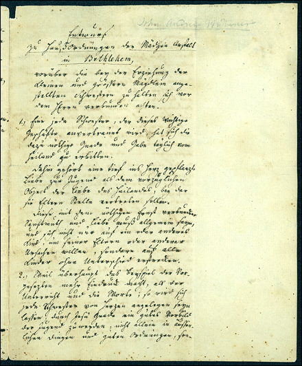Draft of House Rules for the Girls’ School in Bethlehem to which the Sisters who are employed in the training of the Little Girls and Older Girls are to consider themselves bound written by Johann Andreas Hübner, school principal (1785-1790).