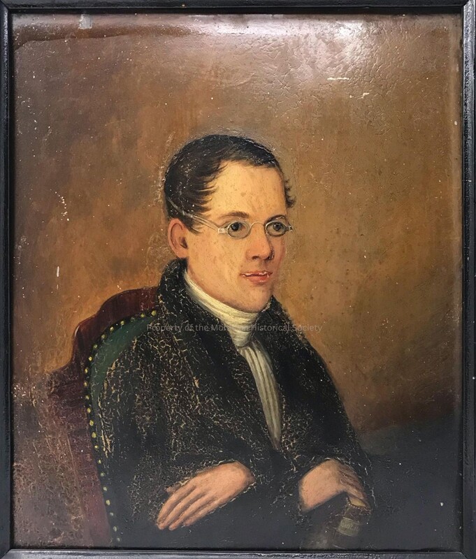 Portrait of a young man from the side, black jacket, white scarve, in oval