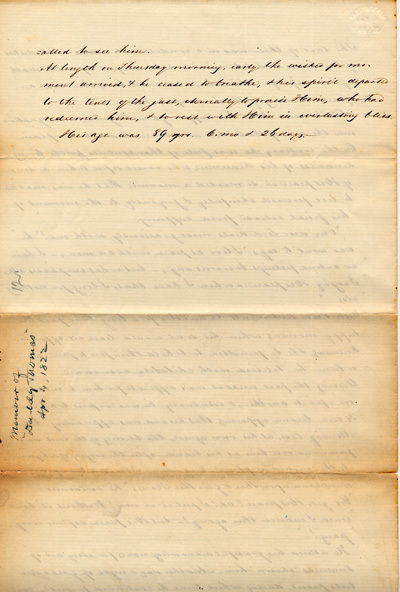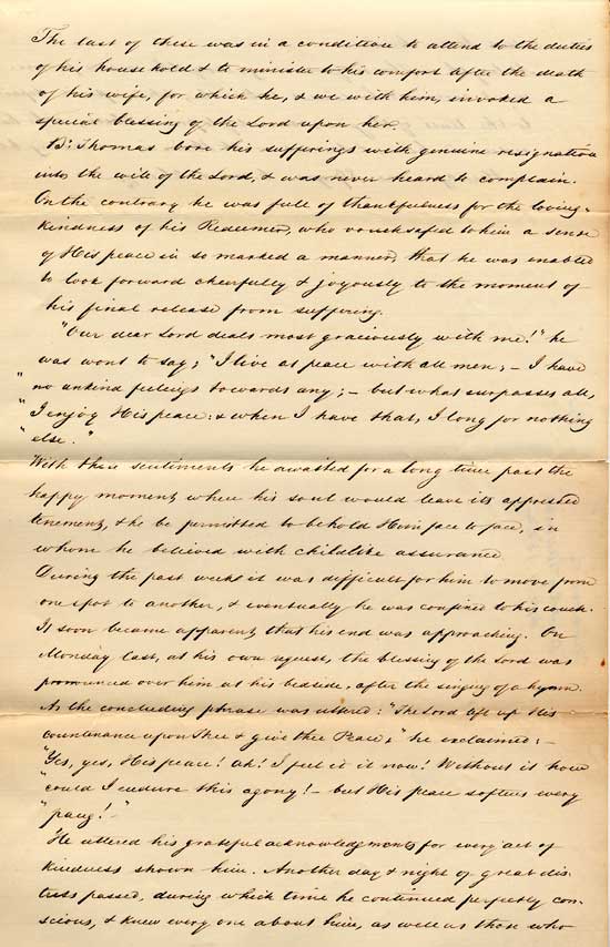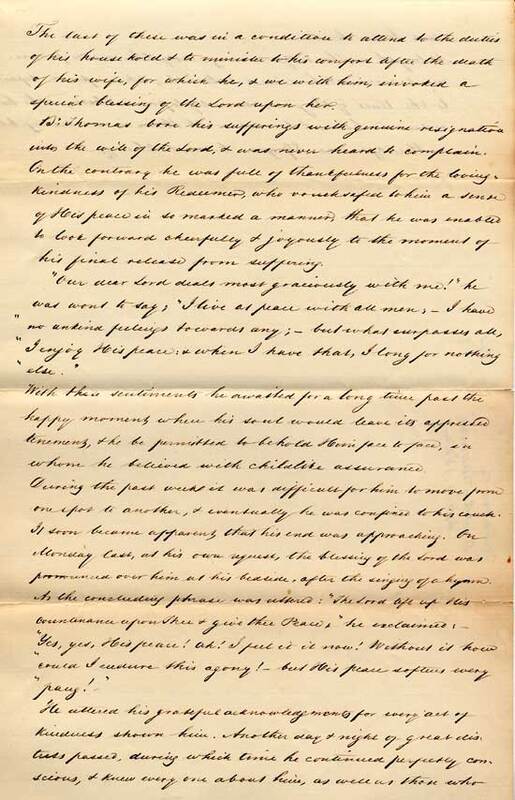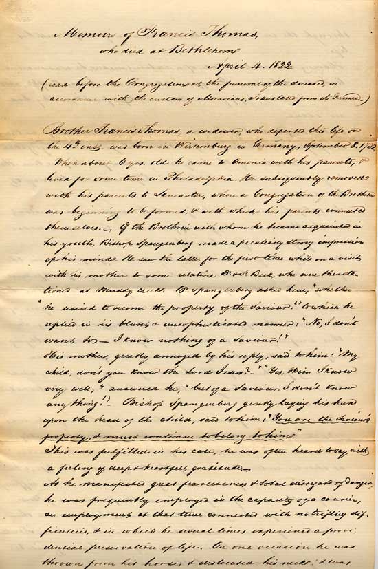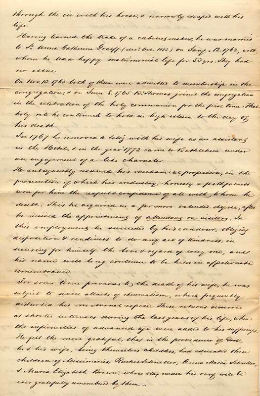 This short biography was written by another brother or sister. The narrative recounts Thomas' birth in Germany and his arrival in America at the age of 6. He grew up in Pennsylvania, first in Philadelphia and then in Lancaster. He was very impressed and touched by a meeting with Spangenberg. He married and moved to Bethlehem in 1772 where he was well respected and loved. The account describes his very painful illness and his resignation in the Lord. There is another version of the memoir written in German in the pages preceding this account in English.