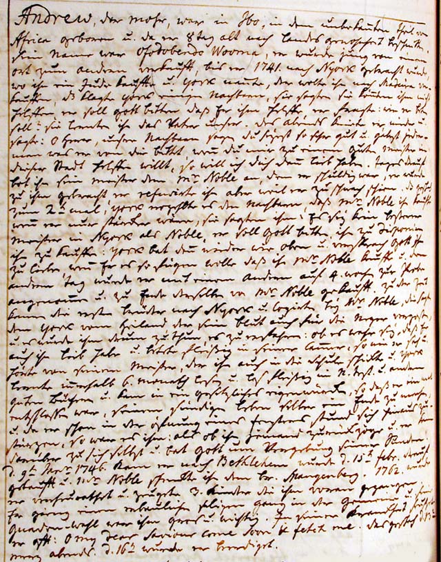 Andrew the Moor was born in Ibo in the unexplored part of Africa and was circumcised when he was 8 days old, according to the local custom. His name was Ofodobendo Wooma and as a child he was sold from one place to another until 1741 when he was shipped to New York where he was named York and bought by a Jew who wanted to sell him in Madeira. York complained about this to several neighbors who told him that they could not help him and that he should ask God for help. He asked how he should pray and they taught him the Lord’s Prayer. That evening he knelt down again and said: "O Lord, our neighbors say that you are very good and that you will give everyone what he requests of you. If You will help me find a good master in this city then I will love You." That day his master offered him to Mr. Noble, in whose debt he was. He [York] was brought to him [Noble], but the latter refused him since he appeared to be too weak. When this occurred a second time, York told the neighbors that Mr. Noble would buy him if he were stronger. They said to him that there was no better master in New York than Mr. Noble and that he should pray to God that he would be disposed to buy him. York then prayed again as above and promised God to love Him if he would arrange it so that Mr. Noble would buy him. The next day he and one other were taken on for a 4 week trial, at the end of which Mr. Noble bought him. At that time the first [Moravian] Brethren came to New York and lodged with Mr. Noble. They told York about the Savior who had shed his blood also for the Negroes [as well as for the whites], and he tried faithfully to understand. Is it true that He also loves him? And he prayed diligently in his room just as he saw and heard his master do, who also sent him to school. Within 6 months York had learned to read and he read diligently in the New Testament and in other good books. He began to think that he had no self-worth and he decided himself to put an end to his sinful life. As he stood in an open window ready to throw himself out he felt as if someone were pulling him back, and thereby he came to himself and asked God for forgiveness of his sins. On the 9th of January 1746 he came to Bethlehem and was baptized on February 15th and Mr. Noble gave him to Br. Spangenberg. In 1762 he was married and produced 3 children who have gone before him [in death]. He lived a pleasant and blessed life [literally: followed a pleasant and blessed course] in the congregation and his election by grace was great and important to him. In his [final] illness he often sighed: "O my dear Saviour come soon & fetch me." That occurred on the 13th of March in the evening. He was buried on the 16th.