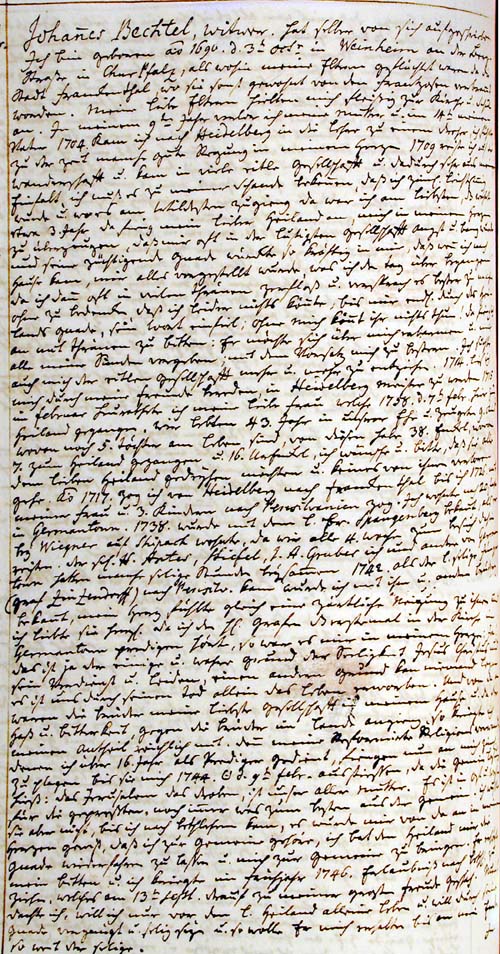 I was born in the year 1690 on October 3rd in Weinheim on the mountain road in electoral Palatinate, where my parents had fled because the city of Franckenthal, where they otherwise lived, had been burned by the French. My dear parents sent me to school and church regularly. In my 9th year I lost my mother and in my 14th [I lost] my father. In 1704 I came to Heidelberg and was apprenticed to a turner. At that time I look for a good stirring of my heart. In 1709 I set out as an itinerant [journeyman], fell into vain company, and lost my innocence. To my shame I must confess that I became rather reckless and where things were wildest that’s where I most enjoyed being; this lasted for about three years. Then my dear Savior began to work in my heart so that I became anxious and afraid in the company of my jolly friends, and his chastising mercy worked so powerfully in me that when I came home I remembered everything that I had done over the course of the day. Then I often dissolved in many tears and promised to make it better without thinking that I unfortunately could do nothing until finally, through the Savior’s grace, his word came to me: Without me you can do nothing, The I began to pray with tears that He would have mercy on me and forgive me all my sins and I resolved to improve myself. I also ttried more and more to free myself from my vain companions. In 1714 I allowed my friends to convince me to become a master craftsman in Heidelberg. In February 1715 I married my dear wife, who went to the Savior here on February 7, 1758. We were married 43 years and had 9 children, of whom 5 daughters are still alive and from them we have 38 grandchildren, of whom 7 have gone to the Savior, and 16 great-grandchildren. I hope and pray that all of them may progress toward the Savior and that none of them will be lost. In the year 1717 I moved from Heidelberg to Franckenthal until in 1726 I moved to Pennsylvania with my wife and 3 children. I lived for 20 years in Germantown. In 1738 I became acquainted with the dear Br. Spangenberg when he was living with Wiegner in Skippack, since we traveled there for a visit every 4 weeks. The blessed H[einrich] Antes, Stiefel, J. A. Gruber, I, and others from Germantown had many blessed hours together with each other. In 1742, when the dear Blessed Disciple (Count Zinzendorff) came to Pennsylvania, I became acquainted with him and other people [and] my heart quickly felt a tender inclination to him and I came to love them heartily. When I heard the blessed Count preach in the church in Germantown for the first time it was this way in my heart: "Yes! That is indeed the true and only basis of blessedness: Jesus Christ and his merits and suffering. No other foundation can one lay. It is only through his death that life is earned." And from then on the Brethren were the dearest visitors in my house, and when hate and bitterness against the Brethren began to grow in the country I received my own portion in abundance. Then my Reformed religious relatives, among who I had served as a preacher for more than 16 years, began now to torment me somewhat until they expelled me on Sunday, February 9, 1744. The congregation’s watchword for that day was: "The Jerusalem above is mother to us all. In the East and the West it is for those who are pressed down, still always something for the best from the congregation." I did not know it [the watchword], however, until I came to Bethlehem but thereafter I knew in my heart that I belonged in the congregation. I asked the Savior to see to it that I received grace and to bring me to the congregation. He heard my plea and in early 1746 I received permission to move to Bethlehem which, to my great joy, occurred on September 13th. "Now!" I thought, "I will live for the dear Lord alone and through his grace I will be productive and blessed and thus he will keep me until my end." Thus far [what] the blessed [brother wrote himself].