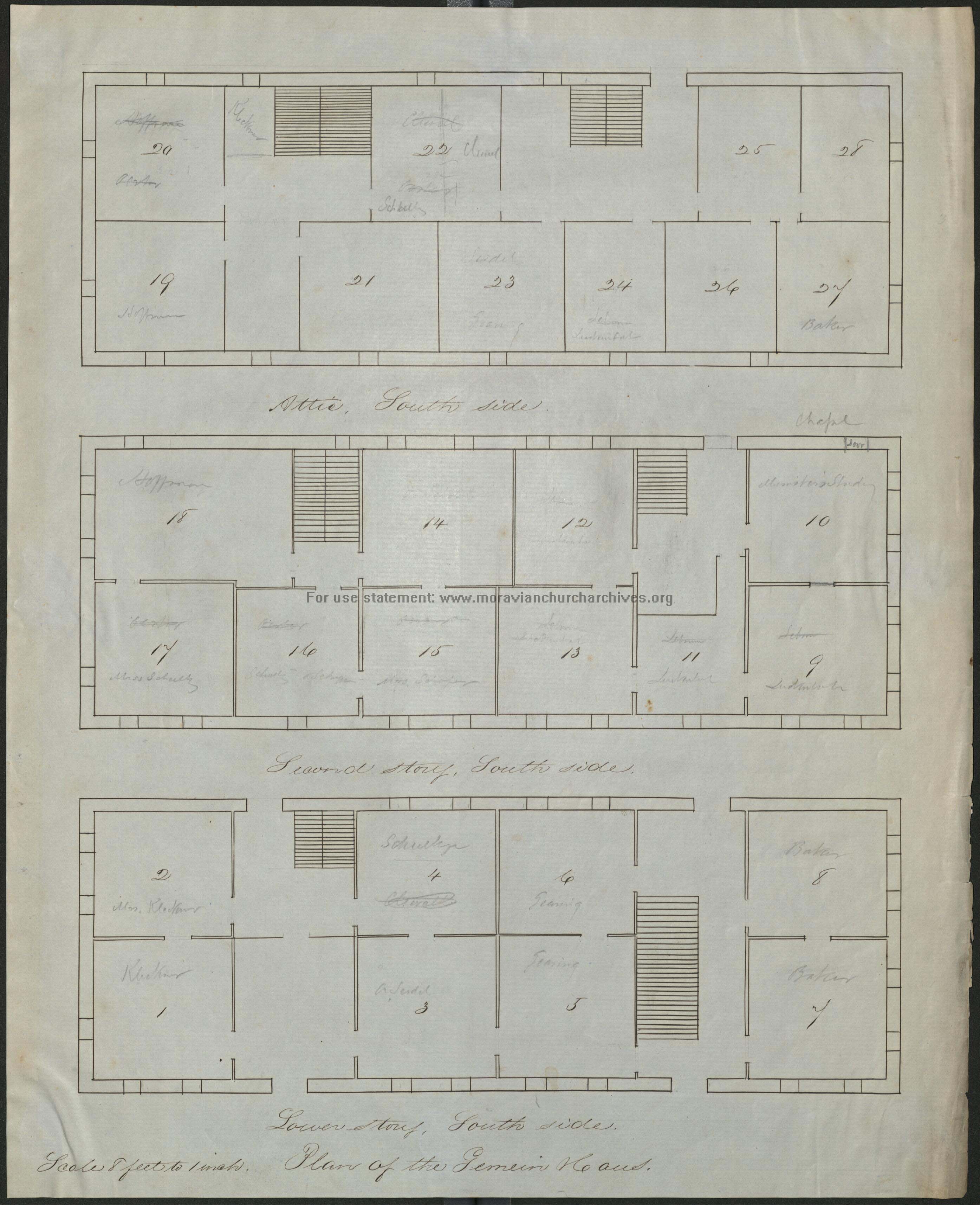 Floor plans for the Gemeinhaus in Bethlehem, Pennsylvania, with names of the occupants of each room