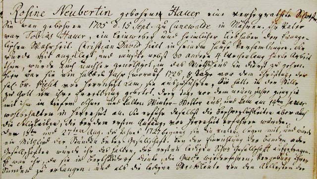 She was born on September 15, 1705 in Cunewald, in Moravia. Her father was Tobias Hauer, a linen weaver and a secret lover of the evangelical truth. Christian David held meetings in his house. She was charged for this, and had to perform four weeks of hard labor, alongside thirty other souls, and then afterwards was forced into service in the public house. There she was for a half year, which was 1726; eight days before Christmas, the blessed Br. Piesch came from Herrnhut to lead her out. She had prayed to God in the stillness for her rescue. Three days before the new year she left with him in deep snow and cold winter weather, and came safely to Herrnhut on January 14. There, she lived through both the difficulties and the blessings that were experienced in the early days of Herrnhut. She took part in and celebrated with many blessings the 13th and the 27th of days of August 1727, and was a member of the hourly-prayer group. When the Bands or societies were established, she was assigned with holding the first Single Sisters’ community. While she served in Berthelsdorf, she achieved forgiveness for her sins and received mercy, and when the single women were spoken to over the grounds for their salvation, she told her story simply. After a trip to Moravia in July 1728, with Anna Berger who was fetching a child whom she had left behind, where she [Rosina] experienced many special protections, she came again to Herrnhut, in the kitchen of the Orphans’ House. She was blessed as an eldress of the Single Sisters in the beginning of 1729. She was among the eighteen Single Sisters who, on May 4, 1730, made a bond not to follow their own discretion in the matter of their marriages, but to give themselves to Jesus’ heart and His guidance, which agreement the Savior has so blessed. On November 26, 1734 she was married to Daniel Neubert by Herr Rothe*; the first marriage performed in the Herrnhut Saal. On that date in 1784 she celebrated here in Bethlehem her fiftieth wedding anniversary with her dear husband, to her and the whole GemeineÕs joy.