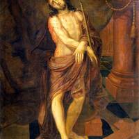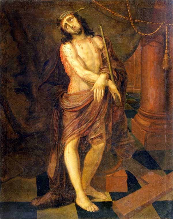 "Christ Scourged", "Jesus Scourged" or "The Mocking of Christ" illustrates the Bible passage, “Then Pilate took Jesus and had him flogged. And the soldiers wove a crown of thorns and put it on his head, and they dressed him in a purple robe. They kept coming up to him, saying, ‘Hail, King of the Jews!’ and striking him on the face.” John 19:1-3
