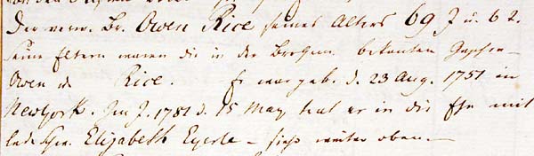 The Widowed Br. Owen Rice, aged 69 years and 6 days. His parents were Br. & Sr. Owen and [blank] Rice, a couple well-known in the Moravian Church. He was born on August 23, 1757 in New York. In the year 1787, on the 15th of May, he entered into marriage with the Single Sr. Elizabeth Eyerle. See further above.