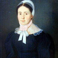 This colored piece was painted by an unknown artist of an unidentified Moravian Single Sister. The pink bow denotes that she was single. Married Sisters are pictured with blue bows.
