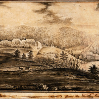 Landscape painting of Bethlehem from the north, looking south from the perspective of modern-day Comenius Hall towards the city, where a horse-drawn wagon enters. Visible buildings at left include the Sun Inn, the Horsfield House and Stranger's Store. The Colonial Industrial Quarter is visible at right. Horses and wooden fences are visible in the foreground, and South Mountain is visible in the distance. Several ducks (or other waterfowl) are visible in the Monocacy Creek at right.