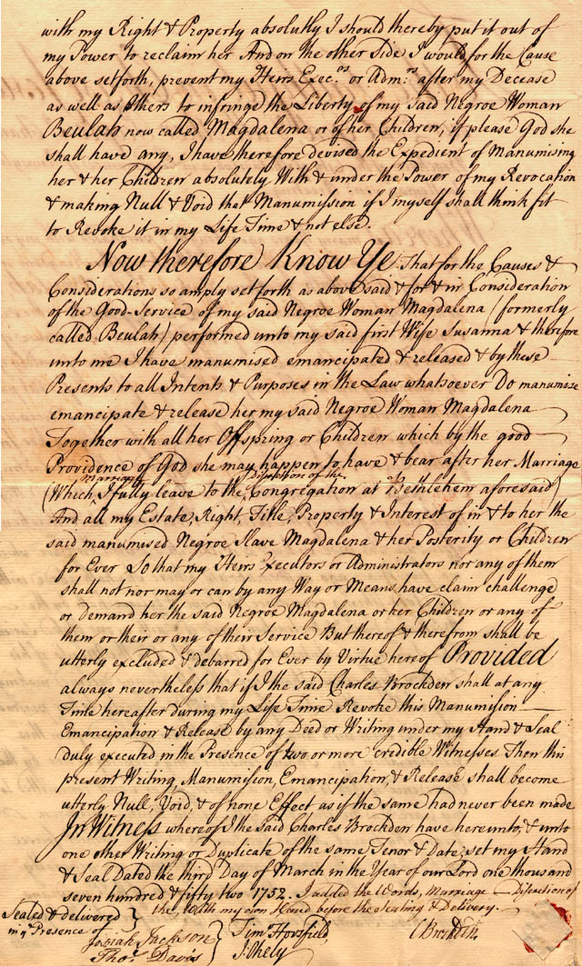 Now therefore know ye that for the causes & considerations so amply set forth as above said & for & in consideration of good-service of my said Negroe Woman Magdalena/ formerly called Beulah/ performed unto my said first wife Susanna & therefore unto me I have manumised emancipated & released & by these presents to all intents & purposes in the law whatsoever do manumise emancipate & release her my said Negroe Woman Magdalena together with all her offspring or Children which by the good providence of God she may happen to have & bear after her Marriage (Which marriage I fully leave to the discretion of the Congregation at Bethlehem aforesaid) and all my estate, right, title, property or interest of in & to her the said manumised Negroe Slave Magdalena & her Posterity or children for ever so that my Heirs, Executors or Administrators nor any of them shall not nor may or can by any way or means have claim challenge or demand her the said Negroe Magdalena or her Children or any of them or their or any of their service but thereof & therefrom shall be utterly excluded & debarred for ever by virtue hereof Provided always neverthless that if I the said Charles Brockden shall at any time hereafter during my life time revoke this Manumisison Emancipation & Release by my Deed or Writing under my Hand & Seal duly executed in the presence of two or more credible witnesses then this present Writing, Manumission, Emancipation, & Release shall become utterly null, void, & of none effect as if the same had never been made. In witness whereof I the said Charles Brockden have hereunto & unto one other Writing or Duplicate of the same tenor & date, set my Hand & Seal dated the third day of March in the year of our Lord one thousand seven hundred & fifty two 1752. I added the words, marriage -- discretion of the, with my own Hand before Sealing & Delivery.