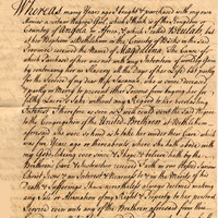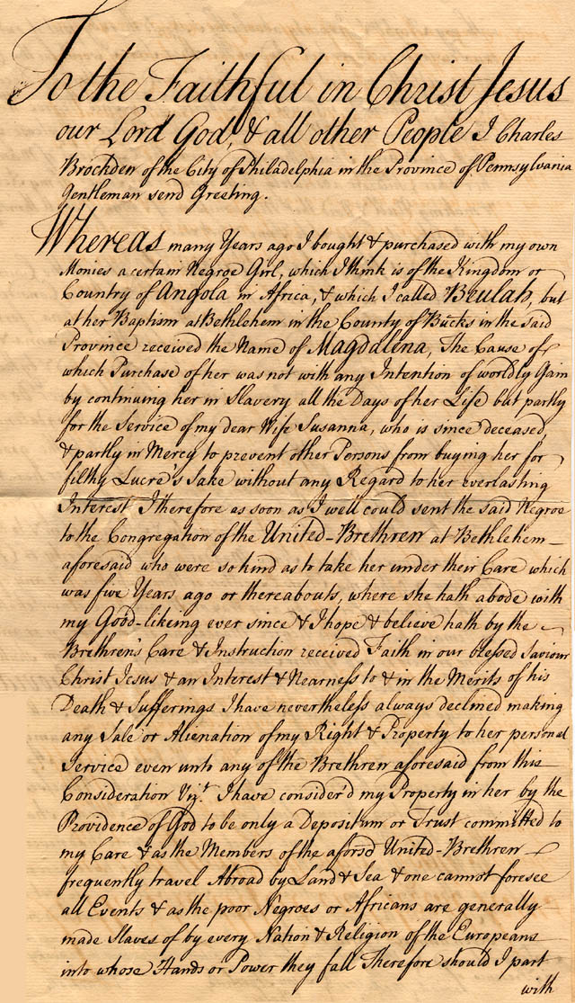 Whereas many years ago I bought & purchased with my own monies a certain Negroe Girl, which I think is of her Kingdom or Country of Angola in Africa, & which I called Beulah, but at her baptism at Bethlehem in the County of Bucks in the said Province received the name of Magdalena. The cause of which purchase of her was not with any intention of worldly gain by continuing her in Slavery all the days of her life but partly for the service of my dear wife Susanna, who is since deceased, & partly in mercy to prevent other persons from buying her for filthy sucre's sake without any regard to her everlasting interest[.] I therefore as soon as I well could sent the said Negroe to the Congregation of the United-Brethren at Bethlehem aforesaid who were so kind as to take her under their care which was five years ago or thereabout, where she hath abode with my good-likeing[sic] ever since & I hope & believe hath by the Brethren's care & instruction received Faith in our blessed Saviour Christ Jesus & an interest & nearness to & in the merits of his death & sufferings[.] I have nevertheless always declined making any Sale or Alienation of my Right & Property to her personal services even with any of the Brethren aforesaid from this consideration viz. I have consider'd my Property in her by the Providence of God to be only a deposition or trust committed to my care & as the members of the aforsd. United-Brethren frequently travel abroad by land & sea & one cannot foresee all events & as the poor Negroes or Africans are generally made Slaves of by every Nation & Religion of the Europeans into whose hands or power they fall therefore should I part with my Right & property absolutely. I should thereby put it out of my power to reclaim her and on the other sides I would for the cause above setforth, prevent my Heirs, Execor. or Adms. after my decease as well as other to infringe the liberty of my said Negroe Woman Beulah now called Magdalena or of her Children, if please God she shall have any, I have therefore devised the expedient of manumising [sic] her & her Children absolutely. With & under the power of my revocation & making null & void that manumission if I myself shall think fit to revoke it in my life time & not else.