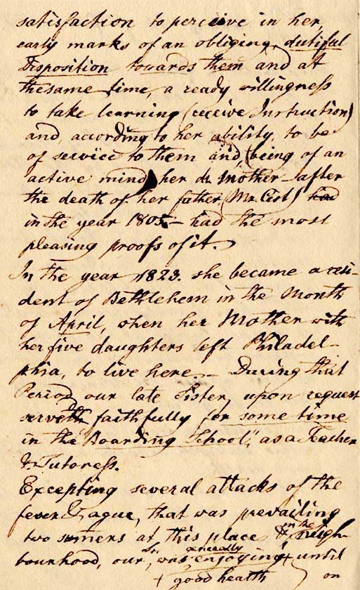 In the year 1823 she became a resident of Bethlehem in the month of April, when her mother with her five daughters left Philadelphia to live here. During that period our late sister, upon request served faithfully for some time in the “Boarding School” as a teacher & tutoress.