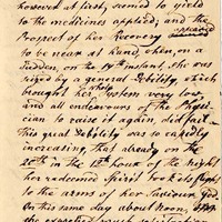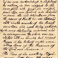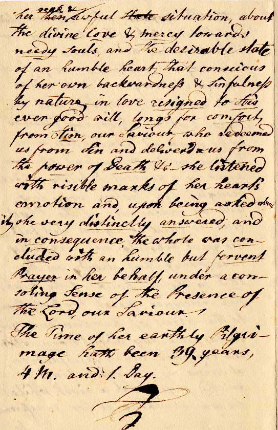 Excepting several attacks of the fever & ague, that was prevailing two summers at this place & in the neighbourhood, our Sr. was generally enjoyment & good health until on the 10th instant, when she complained of feeling sick. The attending physician declared her sickness to be a case of remittent fever; which however at first seemed to yield to the medicines applied; and the prospect of her recovery appeared to be near at hand, when, on a sudden, on the 19th instant, she was seized by a general debility, which brought her whole system very low, and all endeavors of the physician to rain it in, did fail. This great debility was so rapidly increasing , that already on the 20th in the 12th hour of the night her redeemed spirit took it flight to the arms of her Saviour God. ON this same day about noon, she expressed much satisfaction at seeing an old acquaintance & friend paying her a visit. Whilst he was speaking to her in reference to her weak & awful situation, about the divine love & mercy toward needy souls, and the desirable state of an humble heart, that conscious of her own backwardness & sinfulness by nature, in love resigned to this ever good will, longs for comfort, from him, our Saviour who redeemed us from sin and delivered us from the power of death & she listened with visible marks of her heart’s emotion and, upon being asked about it she very distinctly answered, and in consequence, the whole was concluded with an humble but fervent prayer in her behalf, under a consoling sense of the presence of the Lord, our Saviour.