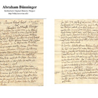 I was born Jan. 18, 1720 in Switzerland in the canton Zürich, in a village called Backen Bülach; it belongs to a little village call Bülach; there I was baptized by a Reformed minister by the name of Caspar Burkhart. I was raised in the Reformed religion. My parent's names were Abraham Bünninger and Verona born Utzinges. Six days before my birth my dear mother had an unfortunate blood letting [surgical], which caused her a fever sickness, so that I was born without her knowledge.
