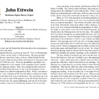 John Ettwein's memoir in which he recounts his ancestry, his religious education, his pious childhood, and his conversion experience as a teenager. He talks about his experience in Hernnhut during the Sifting Time. He recounts his travels throughout Germany and England and his call to America in 1754. He talks about his "pilgrimage" throughout his missionary work in 12 states. He highlights his pious devotion and the Lord's protection throughout his life. The memoir is completed by another brother or sister who recounts the last years of his life. Written in German calligraphy.