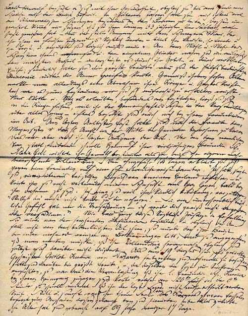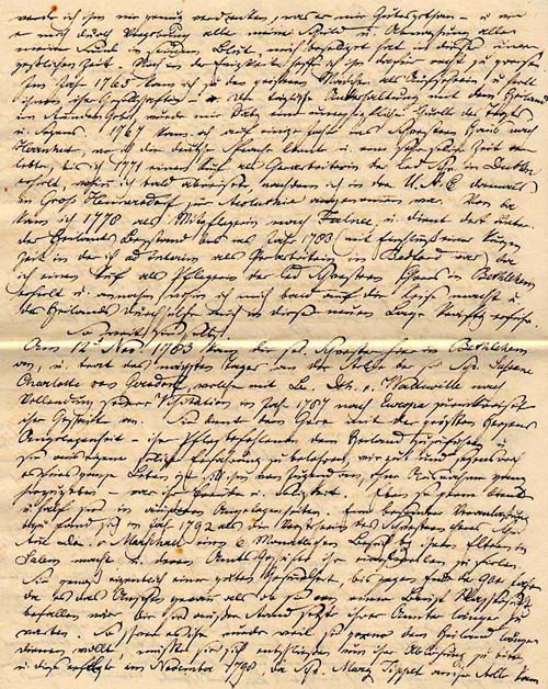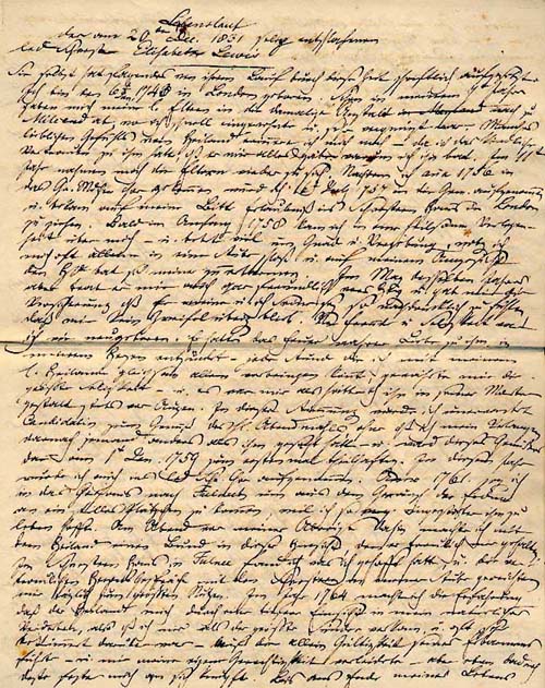 I was born on January 6, 1743, in London. Already in my seventh year, my parents turned me over to the school that was then in Mile End, where I quickly settled in and was very happy. I still remember some delightful feelings of the Savior ? when I had the childlike faith in him that he would grant me all that I asked of him. In the eleventh year, my parents took me back to them. After I came into the Great Girls Choir in 1756, I was taken into the Gemeine on July 16, 1757, and on my request received permission to move to the Single Sisters' House in London. Early in 1758, I entered into a beneficial state of worry and confusion about myself ? I prayed much for mercy and forgiveness, often closing myself in a room alone and, on my face, begging the Savior to have mercy on me. In May of that same year he came before my heart in friendship and gave me to feel so strongly the assurance that I was his and he mine that no doubts remained for me. I was like newly born with joy and salvation. He had lit a fire of true love for Him in my heart—every hour that I could spend alone together with my dear Savior granted me the greatest happiness—and it was for me as if I had Him in His martyrdom constantly before my eyes. In this frame of mind I unexpectedly became a candidate for the enjoyment of the Holy Abendmahl, without having told anyone but Him of my longing for it—and I was a participant in this pleasure for the first time on January 1, 1759. In that year, I was also taken into the Single Sisters Choir. In 1761, I moved to the Choir house in Fulneck, in order to come out of the noise of the world into a still place, because I hope to live undisturbed for Him. On the evening before my departure for Fulneck, I made a covenant with the Savior to this end, which he faithful kept with me. In the Sisters' House in Fulneck, I found what I had hoped for, and the faithful conversations-of-the-heart with the sisters in my room were of great use to me. In the year 1764, I had the experience that the Savior guided me, on the sole-power of his mercy, to a deeper insight into my natural, ruinous state. I felt myself to be the greatest sinner and often was very worried about it—and spoiled my own judgment for me—but even through this, I tied myself even closer to him. Until the end of my life, I will never thank Him enough for what good He did to me—and how He, through the forgiveness of all my guilt and the washing of all my sins in His blood, saved me in this unforgettable time. In eternity, I hope to praise Him rightly for this. In 1765, I came to the Great Girls as Aufseherin, and held their societies for them. The daily conversation with the Savior in Prayer-hours became for me an inexhaustible source of comfort and blessing. In 1767, I came for several years to the Sisters' House in Herrnhut, where I learned the German language and experienced a very blessed time, until in 1771 I received a call as Choir Worker of the Single Sisters in Dublin. I soon traveled there, after I was made an Acolyte by the Unity Elders Conference, which at that time was in Gross Hennersdorf. From there [Dublin], I went in 1778 as Co-Pflegerin to Fulneck, and served there with the Savior's support until 1783 (excluding a short time when I was temporarily the Choir Worker in Bedford), when I received and took a call as Pflegerin of the Single Sisters' Choir in Bethlehem, whither I set out, and also in this new endeavor experienced the Savior's aid.
